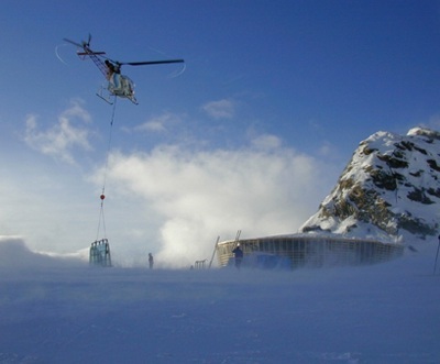 Die konstruktive Besonderheit besteht darin, dass die „Berghütte“ quasi über dem Ewigen Eis schwebt und sich nur mit ihrer Rückseite an einen Felsrücken schmiegt. Das am Bauplatz ca. 60 m tiefe ewige Eis fließt mit bis zu sechs Meter im Jahr unter dem Gebäude hindurch. Auf einem kleinen Felsvorsprung steht ein dreigeschossiger Stahlturm von vier Metern Durchmesser, der über Stahlbetonbalken mit 12 m langen Stahlankern in der Felswand befestigt ist.
