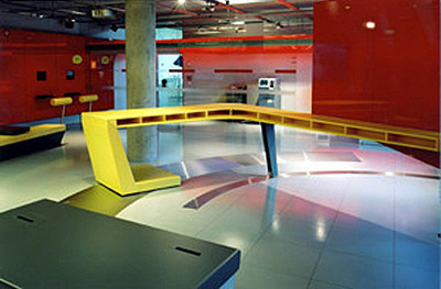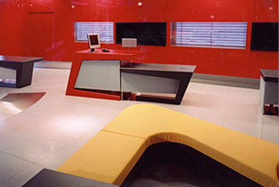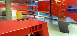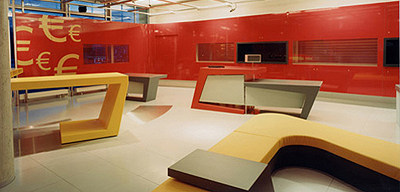 Auch die Sparda-Bank in Villach vernimmt die Zeichen der Zeit: Anstelle einer Wand gibt es eine gekrümmte und die Servicezone umschließende „Info-Wall“; anstelle von Tischen ist hier von Infopulten die Rede, die „locker und luftig“ im Raum stehen. Farb- und Formgebung leiten sich aus dem Logo der Bank ab und sollen die Identifikation mit dem Unternehmen verstärken. Die als Informationsträger unterschiedlichster Art dienende Info-Wall liefert als raumumschließender Paravent das Hintergrundbild für das tägliche Bankgeschäft. Die bumerangförmigen Möbel scheinen sich plastisch aus der Wand zu falten, bewegliche Trennelemente gewähren die bisweilen geforderte Diskretion im Kundengespräch.