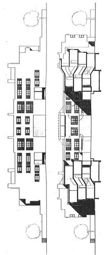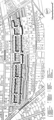 Das typologische Konzept folgt der topografischen Lage der langen, schmalen Streifenparzellen und fügt sich durch die niedrige Randbebauung mit Höfen (Arkadenwohnhöfe, Ahornhof, Ebereschenhof, Buchenhof, Pappelhof) und Plätzen (Vorplatz, Birkenplatz, Lindenplatz) maßstäblich in die Umgebung ein. Arkaden am Rand der Höfe, Dachterrassen, Loggien und Brückentorbauten als Hofabschlüsse bestimmen die leicht geschwungenen Zeilen. Ein vielfältiges Wohnungsangebot mit geschossebenen Raumfolgen, Maisonnette- und Split-Level-Wohnungen in zwei bzw. drei Ebenen kommen dem Wohnwunschbild „Einfamilienhaus“ überraschend nahe. Die Autoabstellplätze wurden an den Rändern der Siedlung in Erdmulden angeordnet. Die in Beton-Fertigbauweise realisierte Wohnhausanlage mit einem signifikanten Fugenbild weist als Charakteristikum grüne Schiebeläden auf, die den dörflichen Charakter der Bebauung ohne heimattümelnde Geste verstärken. Dieses Projekt, das im geförderten Wohnungsbau der 1980er Jahre neue Wege beschritt, wurde 1984 mit dem Bauherrenpreis der ZV ausgezeichnet und gilt noch heute als eines jener raren Wohnbau-Beispiele, die sich mit den Leistungen des Roten Wien messen können.