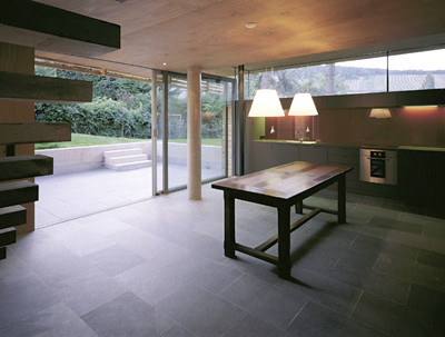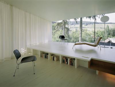 Dieses Anforderungsprofil ließ zwei unterschiedliche Räume entstehen: Im auskragenden Obergeschoss eine weiße Röhre, im Norden mit einem Panoramafenster zu den Weinbergen geöffnet, das andere Ende durch eine abgeschirmte Südterrasse (als Zimmer im Freien) begrenzt.