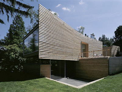 Die Westfassade/-terrasse mit ihren Lamellen trennt membranartig Gartenraum und Innenraum, um die ohnehin begrenzt verbleibende Grünfläche nicht zu drücken. (Gabriele Kaiser nach einem Text der Architekten, 25.09.2002)