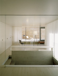 Unter diesem holzverkleideten Baukörper befindet sich der zweite Raum, eingegraben in der Erde mit Zugang zu Weinkeller und Bad. Mit vorgelagertem Aussenraum dient dieser „erdige“ Bereich kulinarischen Aktivitäten, während der „weiße“ Raum der Entspannung und Ruhe vorbehalten ist. Um diese Atmosphäre bei Bedarf noch zu verstärken, können zwei Raumzonen aus rundum laufenden Stoffbahnen gebildet werden, die ansonsten in integrierten Kästen verschwinden.