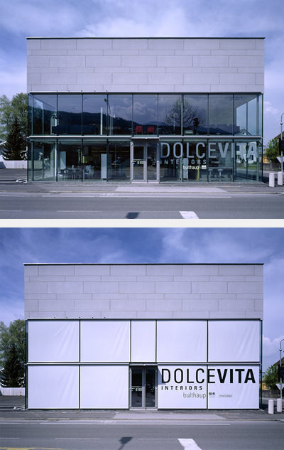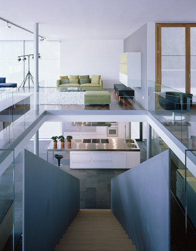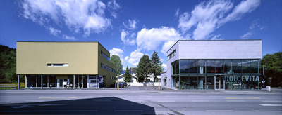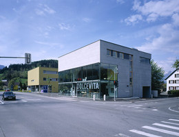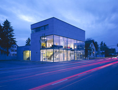 Der nach Westen terrassierte Parallelbau soll im rückversetzten Erdgeschoss künftig eine Videothek beherbergen, während die beiden geschlossenen (grob verputzten) Obergeschosse zur Gänze für Wohnzwecke genutzt werden. Auch hier sorgen grosse, von der Bundesstrasse abgeschirmte Terrassenflächen für unbehelligte, in den Außenraum verlängerte Privatsphäre. Gang und Nebenräume der 5-Zimmerwohnung sind auch hier von oben belichtet und strassenseitig fensterlos. Beide Häuser wurden durch Tiefgarage und Kellerräume miteinander verbunden – unter der Erde schließt sich eben der Kreis. (Text: Gabriele Kaiser, 12.09.2002)
