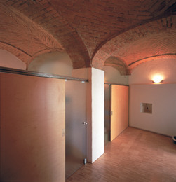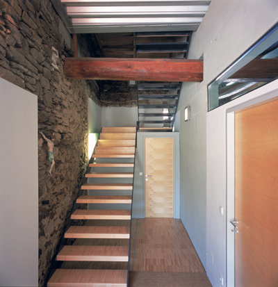 Öffnungen in das hermetische Volumen werden extrem lapidar gesetzt und durch Lichtumlenkungen im Inneren effizienter gemacht. In der Beuge des L-Traktes wird dem alten Raumquadranten in voller Höhe eine neue Tragstruktur eingepflanzt. Zwei papierdünne, scherenschnitthafte Betonscheiben sind mit zwei weiteren Scheiben wie der bekannte Tragsitz aus Armpaaren so miteinander verflochten, dass sie in die tausendjährigen Außenwände aus Stein nur an vier Punkten eingreifen. Diese Struktur trägt Lift, Treppe, neue Wände und Böden; die alten Deckenbalken blieben erhalten und „durchstossen“ die entsprechend perforierten Betonwände.