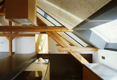Im Dezember 2000 bat er Architekt DI Horst Zauner, eine Raumlösung für den insgesamt 160 m² großen Dachboden zu entwickeln, dessen bestimmende Elemente - die Gespärre (vulgo „Binder“) des Dachstuhls - eine beeindruckende skulpturale Kraft entfalten. Der Raumquerschnitt und die statische Beschaffenheit des Bestandes ließen glücklicherweise einen Umbau ohne Eingriff in die Substanz zu. Die Kniestockhöhen waren ausreichend, die Decke bedurfte keiner Verstärkung, die Gespärre konnten unverkleidet bestehen bleiben. Der Einreichplan sah noch den Ausbau des gesamten Dachbodens vor, die Hälfte (rund 80 m²) wurde tatsächlich als Wohnraum neu adaptiert, wobei einer künftigen Ausweitung der Wohnfläche nichts im Wege steht.