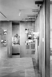Das kleinteilig organisierte, generalsanierte Gebäude wird über eine einläufige, mit Perger Granit belegte Stiege erschlossen. Man gelangt in die zwei Obergeschoße mit den Ausstellungsräumen, die sich thematisch in drei abgegrenzte Zeiträume gliedern, wobei die mittige Lage der Treppe einen automatischen Rundgang auf einer Ebene bewirkt. Dadurch ergibt sich eine logische Orientierung in der Raumabfolge, was gerade bei einer historischen Ausstellung als sehr angenehm empfunden wird. Die Präsentation der vorwiegend schwarzweißen Dokumente, Photos, Zeitungsausschnitte und Plakate erfolgt auf Glastafeln, die jedoch mit undurchsichtigen, raumteilenden Platten (weißes Plexi oder Eternit) mit Distanz hinterlegt sind. Diese bilden die Träger für die - im wahrsten Sinne des Wortes - Hintergrundinformation, die auf roter Folie appliziert ist. Gegenüber den Exponaten hat dieser Farbfleck natürlich einen sehr hohen visuellen Aufforderungscharakter und bildet somit die perfekte informative Ergänzung.