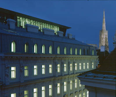 Im Aufbau befinden sich Räume für die Haustechnik, Sitzungszimmer und ein Betriebsspeisesaal. Der Ausblick ist einzigartig, in alle Richtungen offen. Man muss es dem Bauherr hoch anrechnen, dass diese Hochlage nicht einem Direktor für dessen privates Penthouse vorbehalten wird – wie etwa im Fall des von Harry Glück für die BAWAG umgebauten Kachelhauses am Fleischmarkt. Auch wenn der Aufbau am Michaelerplatz nicht öffentlich zugänglich ist, so wird sich doch eine Möglichkeit finden, um hinaufsteigen zu können.