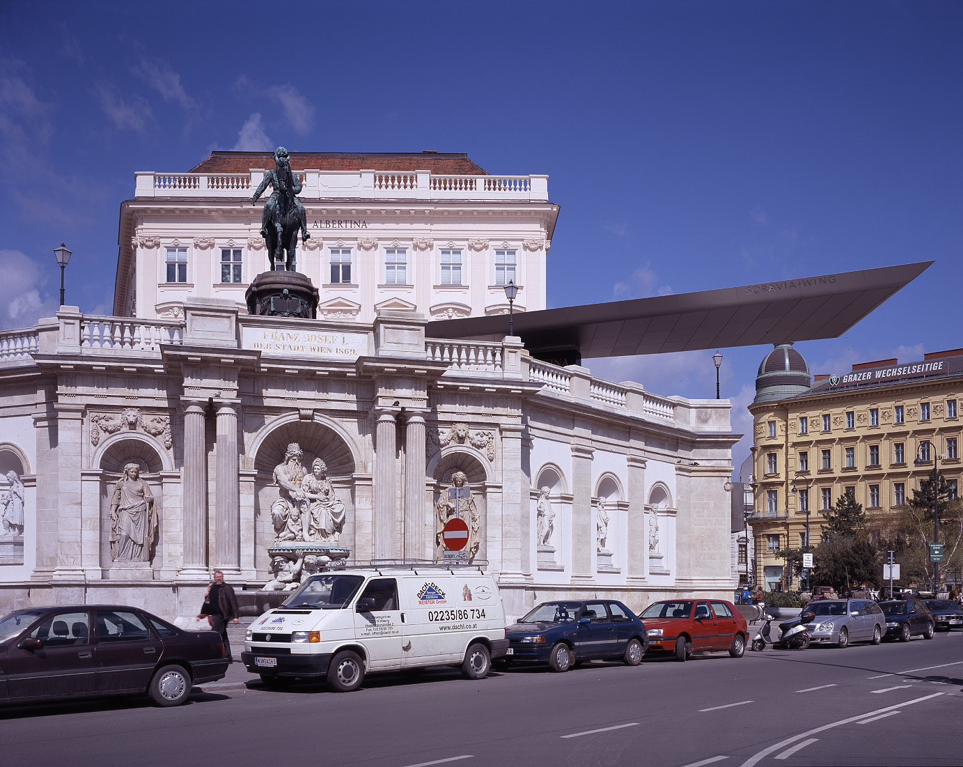 Vor ähnlichen Problemen stand man in Wien, als es darum ging, das für seine Grafiksammlung weltbekannte Albertina-Palais zu erweitern. Dieses erhebt sich neben der Hofburg auf dem letzten Überrest der nach den Türkenkriegen angelegten Basteien, unter welchem Fragmente der mittelalterlichen Stadtmauer verborgen liegen. Auf diesem Augustinerbastei genannten Bollwerk entstand um 1650 der kaiserliche Bauhof, der später von Graf Sylva-Tarouca, dem Statthalter der Niederlande, zum Palais erweitert und schliesslich von dessen Nachfolger Herzog Albert von Sachsen-Teschen übernommen wurde. Dieser liess den Bau von Louis de Montoyer um einen 180 Meter langen, zum Burggarten hin orientierten Westflügel mit 33 Fensterachsen erweitern und Räumlichkeiten des angrenzenden Augustinerklosters für die von ihm angelegte Grafiksammlung umgestalten. Sein Alleinerbe, Erzherzog Carl, betraute 1822 den grossen Wiener Klassizisten Josef Kornhäusel mit dem Umbau der Erschliessungs- und Repräsentationsräume. Nach der Schleifung der meisten Basteien in den 1850er Jahren erhob sich nun das kurz darauf in seiner äusseren Erscheinung den historistischen Formen des Ringstrassenstils angepasste Albertina-Palais einsam und nur über zwei lange Rampen erreichbar auf seiner elf Meter hohen Bastei. Die schweren Kriegsschäden aus dem Jahre 1945 nahm man deshalb zum Anlass, die Rampe zur Augustinerstrasse durch eine kurze, steile Treppe zu ersetzen, die neue Stützmauer zur Strasse hin als Sockelgeschoss der Ostfassade zu gestalten und hier, im einstigen Kellerbereich, den neuen Haupteingang zu schaffen - eine Lösung, die nie befriedigen konnte, weil sie das Erscheinungsbild des Palais stark verzerrte.