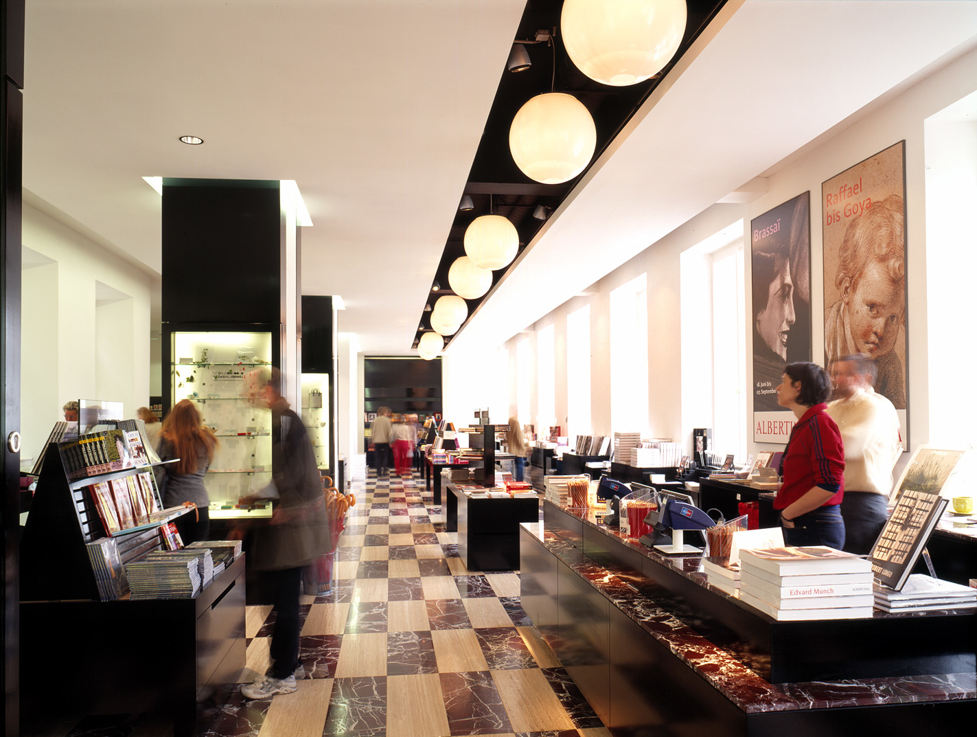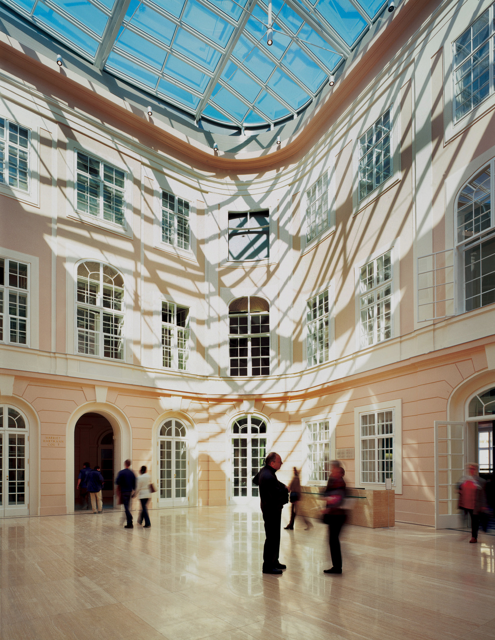Seit der Eröffnung der neuen Albertina im vergangenen März (NZZ 15. 3. 03) gelangt man nun gleichsam durch die Stützmauern der Bastei hinauf zum Museumseingang. Dazu wurde zwischen dem 1864 von Moritz von Löhr entworfenen Danubius-Brunnen und Holleins neuster Wiener Bar ein Hohlraum in der Bastei geschaffen, von dem aus ein gläserner Aufzug und eine Rolltreppe hinauf zum Reiterstandbild Erzherzog Albrechts führen, welches den neu-alten Eingang des Albertina-Palais bis zur Fertigstellung von Holleins Flugdach noch allein markiert. Dieses Dach wird dereinst zusammen mit der ebenfalls von Hollein umgestalteten und mit postmodern anmutenden Wülsten und Bullaugen versehenen Sockelzone am Albertina-Platz dem historischen Bau einen starken zeitgenössischen Akzent verleihen. - Durch das von Steinmayr & Mascher minimalistisch gestaltete Portal betritt man die fast schon ägyptisch strenge Eingangshalle, von der man in den überdachten und sorgsam in den Zustand von 1822 zurückversetzten Innenhof der Albertina gelangt. Dieser wurde von den beiden Vorarlbergern geschickt zum Scharnier der erschliessungstechnisch höchst komplexen Palastanlage bestimmt. Rechts gelangt man in den von Callum Lumsden eingerichteten Museumsshop, links in das vom jungen Wiener Architekten Arkan Zeytinoglu gestaltete Café und geradeaus in die Minervahalle, die den Auftakt zu Kornhäusels Erschliessungssystem bildet. Hier teilen sich erneut die Wege: Links führen Rolltreppen einer leuchtenden Glaswand entlang hinunter in den von Steinmayr & Mascher als flexiblen White Cube konzipierten Ausstellungssaal in der Bastei. Nach vorn schliesst an die Minervahalle der Säulengang an, auf den sich links ein weiterer Ausstellungsraum, die grosse Pfeilerhalle, öffnet. Über die Sphinxstiege erreicht man das Piano nobile, wo rechts der Ausstellungsparcours der Propter-Homines-Säle beginnt, während zur Linken Kornhäusels Musensaal lockt: das von Apoll und den Musen des Canova-Schülers Josef Klieber bevölkerte Herzstück der Prunkräume.