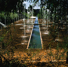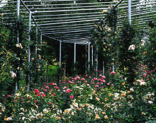 In den berühmten Gärten des 16. und 17. Jahrhunderts fand der Lauf des Wassers sein Ende meist in einem prachtvollen Wasserparterre oder in einem grossen ruhigen Wasserspiegel, der das Meer und zugleich das Ende des Lebensweges versinnbildlichte. In Gustafsons Garten endet der Lauf unvermittelt in einem Rückhaltebecken aus Beton auf der untersten Gartenterrasse. Nur wenige Schritte weiter gelangt man zur stählernen Pergola der «Roseraie», einem von Rosen umrankten Raum auf etwa tausend Quadratmetern Grundfläche. Auch diese Struktur ist der Topographie angepasst und wirkt von weitem wie ein fliegender Blütenteppich, unter dem die Besucher den duftenden Schatten geniessen können.