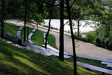 Bereits im Wettbewerbsplan mit seinen eleganten, wie im textilen Faltenwurf fliessenden Grundformen wurde deutlich, dass Gustafson nicht historische Einzelmotive seriell aneinanderreihen wollte. Sie entwarf vielmehr eine Art Gesamtkunstwerk, das sie in die teilweise skulptural modellierte Topographie einbettete. Den Steilhang liess sie mit sanft gewellten Terrassen überziehen und diese monochrom mit Stauden und Gräsern bepflanzen. Von weitem erinnert das Relief an die Spuren eines Pfluges und somit an die ehemalige landwirtschaftliche Nutzung des Terrains.
