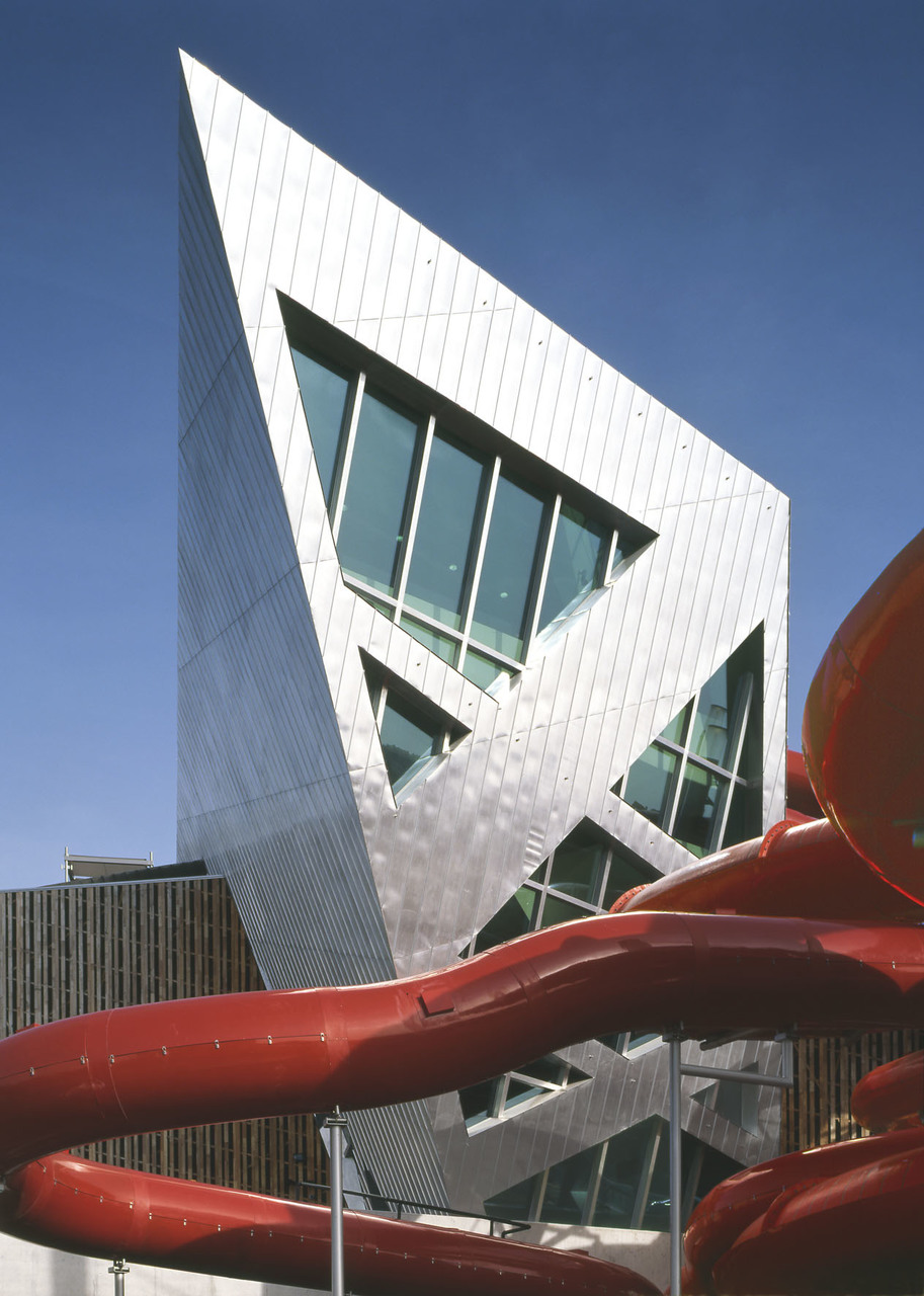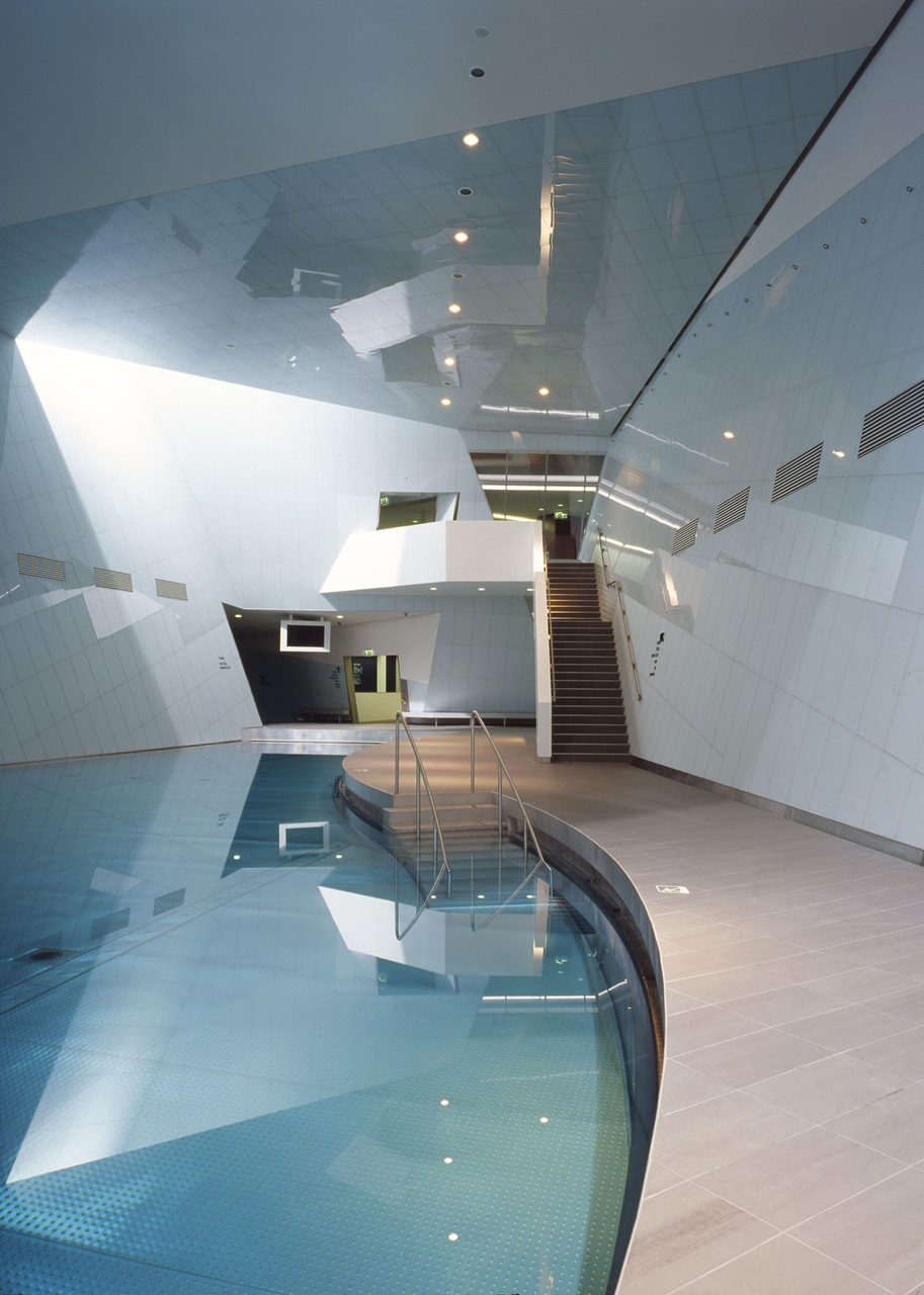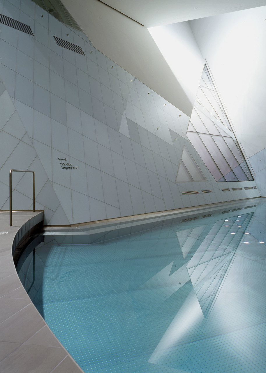 14:20 Auf dem Gang ins Bad durchqueren wir mit unseren mit Bademantel und Tüchern gefüllten Taschen die Mall. Zum ersten Mal spüren wir, was das Nebeneinander von Shopping und Baden bedeuten kann: Es ist ein seltsames Gefühl, demnächst ins Wasser zu springen, während nebenan eingekauft wird. Dennoch sind wir gespannt auf das Erlebnisbad, da Libeskind in diesem Bereich mehr oder weniger freie Hand hatte.