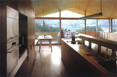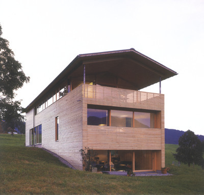 Das Haus von Dietrich/Untertrifaller (Projektleitung: Marina Hämmerle) ist in seiner Gestalt eine zeitgemäße Weiterführung der Bregenzerwälderhäuser: schlicht, praktisch und mit jener Eleganz im Detail, welche die bisherigen Arbeiten des jungen Büros auszeichnet. Typologie und Form wurden allerdings auch durch die örtlichen Baubestimmungen beeinflusst, die eine freiere Interpretation weitgehend behinderten. Mit der Lage an einem Hanggrundstück wurde beim Entwurf natürlich die Frage nach dem Panorama aufgeworfen. Aber nachdem der Bergblick den ganzen Tag über auch ziemlich anstrengend sein kann, haben sich die Architekten darauf konzentriert, nur die Schmalseite des Hauses der wirklich fantastischen Aussicht zuzuwenden. Allerdings wurde gerade wegen der „schönen Aussicht“ das Wohn- und Esszimmer samt Küche ins Obergeschoß verlegt, während der Elternschlafraum im Parterre Blickmöglichkeiten auf den angrenzenden Baumbestand bietet.