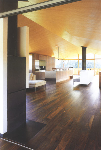 Bei diesem Haus haben Dietrich/Untertrifaller ihr architektonisches Konzept weiter fortgesetzt. Das Objekt ist eine - trotz der Konstruktion aus Holz - feine, vibrierende Hülle, die aus dem Kontrast mit den eingeschnitten Volumina, wie Balkon, Garagentor oder Loggia, ihre eigene Plastizität erhält. Das Material für diese Außenhaut, es ist Weißtanne, hebt sich diskret von den Baustoffen der üblichen Häuser ab. Es bedingt ebenjenen Unterschied in der Wahrnehmung dieses Objekts, der notwendig ist, um die solitäre Gesamtwirkung der Architektur mit ihrer ausgewogenen Proportion und dem traditionell-markanten Satteldach zu unterstützen.