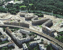 Die 500 Meter lange, lässig geschwungene Wohnwand des Berliner Architekten Georg Bumiller ist das markanteste Stück des grössten Wohnbauprojektes in der Innenstadt Berlins. Sie beherbergt 437 der insgesamt 718 Wohnungen, die für Abgeordnete und Mitarbeiter des Bundestages vorgesehen waren. Das neue Quartier grenzt zur einen Seite an den Bundespräsidentensitz Schloss Bellevue und zur anderen ans Westende des von Axel Schultes und Charlotte Frank entworfenen anderthalb Kilometer langen «Bandes des Bundes», des grössten Bauprojekts für Parlament und Regierung in Berlin.