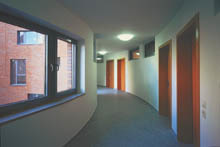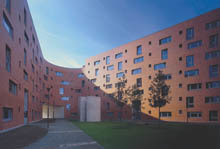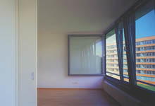 Die Schlange mit ihrer im Sonnenlicht sanft golden schimmernden Klinkerfassade empfängt Besucher und Bewohner auf der nördlichen Eingangsseite mit einer arenaartigen Fassadenwand, wohlkomponiert mit liegenden und stehenden Fenstern durchlöchert. Sie fasst drei gartenähnliche Höfe über der Tiefgarage. Hinter den grosszügigen Fensterbändern auf der Flussseite sind konsequent alle Wohnräume gegen Süden und den Tiergartenpark orientiert. So fällt - in den Aussenkurven natürlich mehr, in den Innenkurven leider weniger - den ganzen Tag Sonnenlicht in die Wohnzimmer.