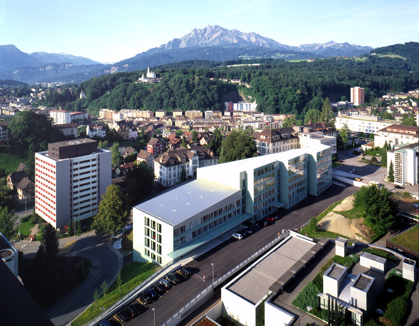 Wer auf dem Luzerner Spitalhügel bauen will, muss sich - neben der Erfüllung des Bauprogramms - mit einer über 100-jährigen Geschichte auseinandersetzen. Hier stehen auf engstem Raum architektonische Zeugnisse verschiedenster Epochen, von denen einige als bemerkenswert klassifiziert werden müssen, so etwa das pathologische Institut von Heinrich auf der Maur ausdem Jahre 1932 und die neue psychiatrische Klinik von Ammann und Baumann von 1996. Beherrscht wird das Areal vom Bettenhochhaus ausden frühen achtziger Jahren, das mit seiner zeittypischen Brauntönung das Schicksal all jenerArchitektur teilt, die von der jeweiligen Gegenwartsszene als überwundene Fehlleistung abgetanwird und so von einer vorurteilslosen architekturhistorischen Wertschätzung bis zur nächsten Generation ausgeschlossen bleibt. Dies war die Ausgangslage, als 1994 die Planung einer neuen Frauenklinik in Angriff genommen wurde. Der räumlichen Komplexität entsprechend musste der Architekt Daniele Marques (damals noch mit seinem Partner Bruno Zurkirchen) ein Volumen gestalten, das sich zwischen dem Bettenhochhaus im Osten und den kleineren Trakten im Westen behauptet und die beim Bauplatz beträchtliche Hanglage besänftigt. Schliesslich sollte die Materialisierung der Aussenhülle Eigenständigkeit verleihen, ohne sich aufzudrängen.