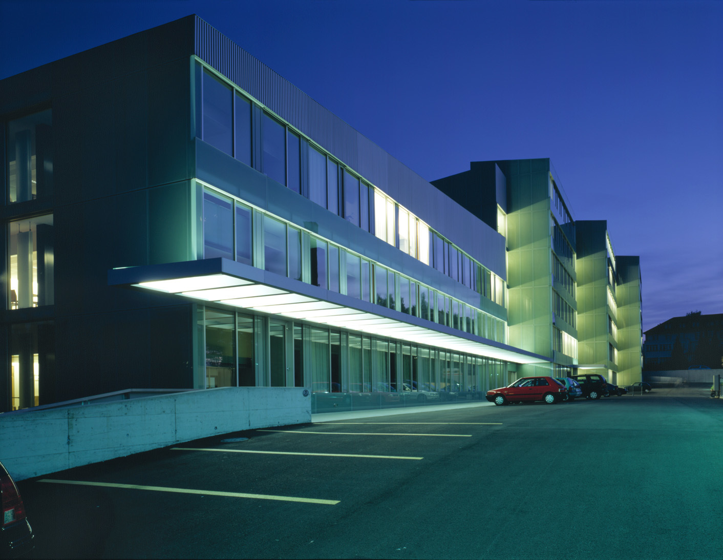 Exakt am Übergang zwischen dem Kopfbau und dem Bettenflügel zeigt die geschossübergreifende Befensterung das entschiedenste architektonische Element im Innern an, einen als Scharnierfungierenden Treppenschacht, der dank raffinierter Lichtführung den trapezförmigen Freiraum vor den Patientenzimmern mit den schmalen Gängen des Büro- und Schultraktes verbindet. Hier intensivierte die bereits in der Projektierungsphase zugezogene Künstlerin Carmen Perrin das Spiel der durch Glaspaneele und Glasbrüstungen initiierten Spiegelungen mittels einer zusätzlichen Schicht aus schwarzem Eisenoxid, die von der Künstlerin auf Hochglanz poliert wurde. Die übrigen Eingriffe von Perrin sind ausgesprochen spartanisch, aber subtil auf die Funktion des neuen Gebäudes abgestimmt. Von ihr ausgesuchte Zitate - poetische Gedanken von Frauen - zieren die Wände, wobei die Schriftzüge aus durchsichtigem Harz nur bei austariertem Lichteinfall erkannt werden können. Diese unprätentiösen Interpretationen sind die einzig adäquate Antwort auf eine Architektur, die Präsenzschafft, ohne auf eine aufdringliche Zeichenhaftigkeit angewiesen zu sein.