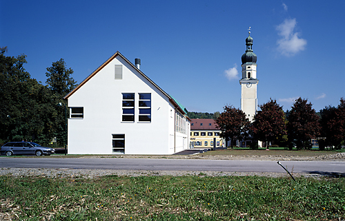 St. Martin im Innkreis hat sich um sein Schloss geschart. Ein ländlicher Herrschaftssitz nicht unbeträchtlichen Ausmaßes prägt das Erscheinungsbild der Marktgemeinde: Was an Gebäuden Anspruch auf Bedeutung erhebt, hat sich seinem strengen, von den Spuren der Verwitterung noch mit einiger Romantik aufgerüsteten Formenkanon gefügt. Auch die neue Musikschule an dem als neuem Ortszentrum projektierten freien Platz unweit der Kirche fügt sich als massiver zweigeschossiger Baukörper mit Satteldach anstandslos in das Ensemble.