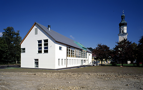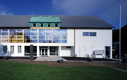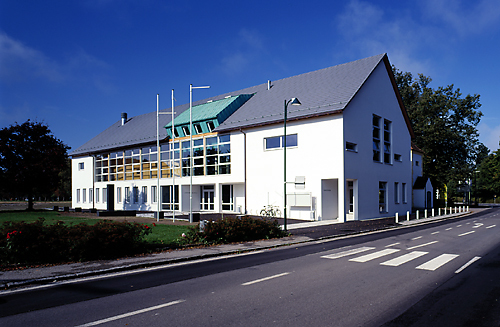 Das Haus steht als langgezoger rechteckiger Baukörper orthogonal zur Hauptstraße und wird so dereinst den Platz flankieren. Mit dem Haupteingang diesem folgerichtig zugewandt, ist das Gebäude auch über einen zweiten Zugang zu betreten, der zu den Parkplätzen in seinem Rücken führt. Eine geräumige Eingangshalle verbindet die Wege und übernimmt ihre Verteilung zu den verschiedenen Funktionen. Denn außer der Musikschule sind die Probelokale von Gesangsvereinen und Musikkapellen im Haus untergebracht.