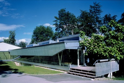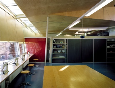 Der Raumquerschnitt ist speziell für die Optimierung der Tagesbelichtung des Innenraumes geformt. So ist die Südfassade leicht nach außen geneigt und das Pultdach hat hier entlang der Traufe einen durchgehenden Oberlichtstreifen. Der Ausblick von den Arbeitsplätzen in die Baumkronen des umgebenden Parks erfolgt über ein schmales, tiefliegendes Fensterband, die Raumbelichtung erfolgt aber durch das gleichmäßige, blendfreie Licht, das aus dem Oberlicht über die geneigte Innenwand in den Raum reflektiert wird.