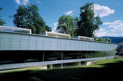 Eine zusätzliche Aufhellung der Kernzonen bringen die nach Norden hochgespreizten Sheds der Dachfläche. Regalwände unterteilen im Innern und sind mit Glasstreifen von Decke und Wänden so abgesetzt, dass der Großraum optisch erhalten bleibt. (Text: Otto Kapfinger, 12.11.2001)