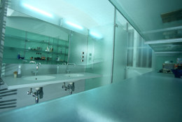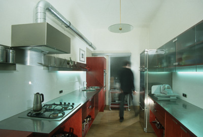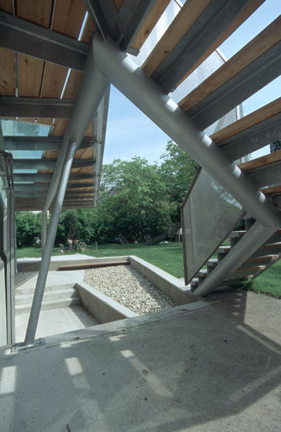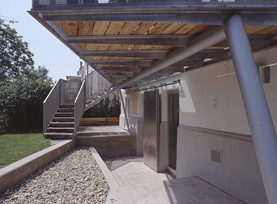 Ein Bock unter der Stiege und zwei schräge Stützen tragen das verzinkte Gerüst aus einfachen Stahlrohren und -profilen; Boden und Trittstufen sind aus simplen Holzbohlen, die Brüstung (wie die mobilen Screens vor den Fenstertüren) mit Netzen aus Edelstahl. Um für die Sockelzimmer den Lichteinfall zu erhalten, ist der Balkon entlang der Mauer partiell mit einem Glasboden versehen. So erhält die gesamte Gartenfront eine zusätzliche Nutzschicht als Gelenk und Filter zwischen drinnen und draußen, und zwar durch eine Konstruktion, die der einfachen Massivität des Alten die einfache Fragilität des Neuen hinzufügt und die auch in sich selbst „flimmert“ zwischen den Polen Transparenz und Abschirmung, zwischen Sachlichkeit und Expressivität. (Text: Otto Kapfinger)