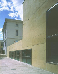 Dem Grazer Literaturhaus ist zwar als neugegründeter Institution viel Interesse entgegengebracht worden, aber die Architektur ist dabei kaum mehr als am Rande erwähnt worden. Sie sticht ja zunächst auch gar nicht ins Auge. Wäre da nicht ein über die Straße gespanntes Transparent, würde sich das ehemalige Stadtpalais des Baron Mayr von Melnhof durch nichts von seinen Nachbarn in der Grazer Elisabethstraße unterscheiden. Die Anlage ist ein Eckhaus und bildet, mit dem Haupthaus und einem Seitenflügel entlang der Seitenstraße, die Form eines „L“. Dieser Figur haben Riegler Riewe einen weiteren Flügel hinzugefügt, so dass sich nun ein „U“ ergibt, das sich zum rückwärtigen Garten öffnet. Der neue Baukörper besteht aus gelb lasiertem Beton, wodurch eine Oberfläche entsteht, die an die vielen leicht vergammelten Fassaden im pseudo-barocken „Schönbrunner Gelb“ erinnert, denen Graz an manchen Tagen seine südlichen Reize verdankt.