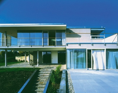 Viele Einfamilienhäuser können es aufgrund falsch gesetzter Wertigkeiten, mangelhaften Raumverständnisses oder oft auch durch ökonomische Zwänge bedingt in punkto Lebensqualität bei weitem nicht mit einer gut konzipierten Wohnung im Geschosswohnbau aufnehmen. Ihr einziger Pluspunkt bleibt ein fragwürdiges „My-Home-is-My-Castle-Gefühl“. Es ist daher bemerkenswert, wenn der - bestens im Bewohnen großer Häuser erfahrene - Bauherr an seinem neuen Haus sehr schätzt, dass er es „wie eine Wohnung bewohnen kann“. D azu gehört der große Vorteil des Wohnens auf einer Ebene oder der kaum pflegebedürftige Außenraum, kurzum - alle Beschwerlichkeiten, die das Wohnen in einem großen Haus üblicherweise mit sich bringt, fallen hier weg. Dennoch handelt es sich hier um kein kleinliches Einfamilienhaus, sondern um eine recht erwachsene Villa, die es nicht nötig hat, sich mit aufwendigen Eyecatchern