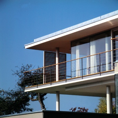 Das Obergeschoß entwickelt sich um den Luftraum der Diele und ist in einen „privaten Rücken“, den Zimmertrakt, und einen „offenen Bauch“ zoniert. Dennoch sind Küche und Wohnraum nicht als typischer Einraum konzipiert, sondern trotz des Verzichts auf Raumteilung in Bereiche von verschiedengradiger Offenheit gegliedert. Auch im Freien entstanden dank breiter Deckenauskragungen geräumigen Terrassen auf beiden Ebenen sowie im völlig zurückgezogenen Gartenhof an der Rückseite des Hauses Freiräume von unterschiedlicher Intimität. Sympathisch wirkt das sowohl innen als auch außen durchgezogene Farbkonzept aus gebrochenem Weiß, sowie Beige- und Grautönen. Sie sorgen für einen dezenten Hintergrund und für eine weiche Lichtstimmung. Reinweiße Fläche gibt es keine.