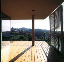 Das steile, nach Südosten Richtung Stadt und Grazer Becken abfallende Hanggrundstück und die alleinige Erschließungsmöglichkeit von unten, lieferten schon maßgebliche Parameter für die Konzeption. Sowohl die attraktive Aussicht, Straße und Zugang an einer Seite boten einen guten Grund, das Wohnhaus selbst so weit wie möglich zurückzusetzen. Neben der Garage, deren Dach zugleich als Terrasse für eine im Erdgeschoß untergebrachte Einliegerwohnung ist, führt eine steile Treppe zum Eingang. Im Erdgeschoß befind et sich als Angelpunkt eine großzügige Eingangshalle, deren Luftraum bis zum Dach reicht. Ein rechteckiger verglaster Dacheinschnitt substituiert ein ebenfalls in Betracht gezogenes Atrium. Die weiße Lamellendecke wirkt wie ein Weichzeichner für das einfallende Licht.