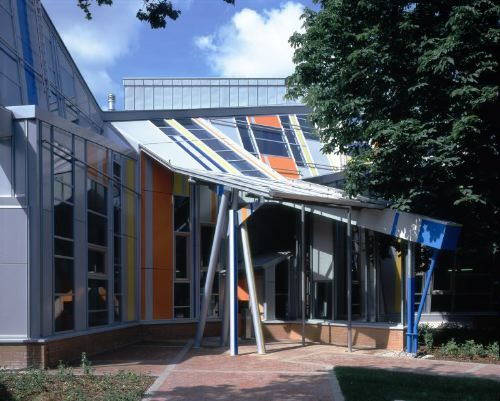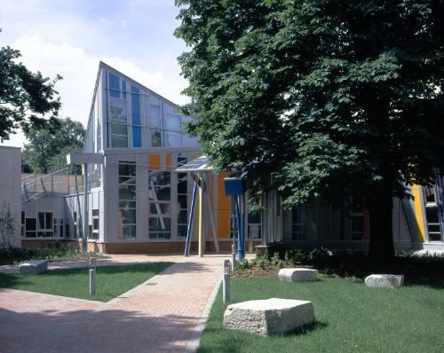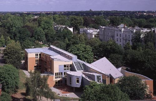 Nähert man sich vom starkbefahrenen Mittelweg der Schule, so nimmt man zunächst nur eine Umfassungsmauer wahr, hinter der sich ein kleiner Patio öffnet. Dort sieht man sich dann ganz unvermittelt einem Architekturschauspiel gegenüber, das sich zu einem dekonstruktivistischen Feuerwerk aus einstürzenden Wänden und verkanteten Kuben steigert. Die bald expressionistisch, bald kubistisch anmutende Eingangsfassade aus Glas und bunt bemaltem Stahl erinnert an Miralles Sportpaläste von Valencia und Huesca, die wie geborstene Brücken bedrohlich in den Himmel weisen. Vor der nach Südwesten exponierten Aussenhaut aus Zinkblech und rosa Verputz denkt man hingegen an Bauten von Gehry, mehr aber noch an Raumstrukturen von Tschumi oder Eisenman. Hier wird deutlich, dass Miralles die beiden Formzertrümmerer seit seiner Zeit als Professor in Harvard und an der Columbia University kannte und ihnen viel verdankte. Allerdings verschmolz Miralles die Einflüsse, zu denen sich in Hamburg noch die Backsteintradition gesellte, zu etwas eigenständig Neuem. - Wie Miralles und sein Team auf den parkartigen Ort reagierten und daraus allmählich die eigenwillige Form des Schulhauses extrahierten, konnte man im Juli in einer kleinen, informativen Schau in der Galerie Renate Kammer am Hamburger Münzplatz sehen. Dem traditionsbewussten Katalanen blieb offensichtlich nicht verborgen, dass in einer Stadt wie Hamburg, die einst mit Fritz Schumacher (1869-1947) einen auch auf dem Gebiet des Schulhausbaus bedeutenden Architekten besass, Bauten für den Unterricht immer auch am Bestehenden gemessen werden müssen. So wirken denn die Klassen-, Übungs- und Versammlungsräume bezüglich Grösse, Belichtung und Zugang ganz vertraut - ausser dass sie im Grundriss ab und zu gegen das ungeschriebene Gesetz des rechten Winkels verstossen.