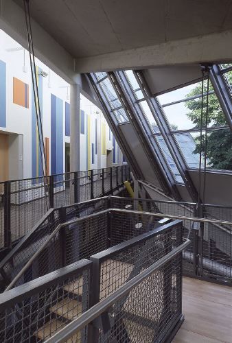 Der Unterschied zu herkömmlichen Schulbauten liegt in der Erschliessung. Diese erfolgt nicht wie bei Schumacher über integrierte Seitengänge, sondern durch eine Architekturlandschaft, die - wie an Mikadostäben aufgeständert - am eigentlichen Schulhaus klebt. Die als Laufstege inszenierten Zugangsplattformen der einzelnen Geschosse sowie die dazwischen vermittelnden Treppen und Rampen sind hinter die zum Patio hin so dramatisch in Erscheinung tretende Membran aus Glas und bunt bemaltem Stahl gesetzt. Was von aussen willkürlich wirkte und mitunter an die aufgerissenen Wände eines Bürohauses erinnerte, macht von innen gesehen plötzlich Sinn. Selten hat man sich in einem Schulhaus so leicht und unbeschwert gefühlt; selten auch konnte das Auge so frei wandern: hier ein Blick auf vorüberziehende Wolken, dort auf ein Stück mit Farn bewachsenen Waldboden und schliesslich auf eine historistische Kirche in warmem Backsteinrot. Allgegenwärtig bleiben dabei als zentrale Themen Rhythmus und Klang: Was Miralles hier geschaffen hat, tönt wie gebaute Musik. Dass dabei nicht alles bis ins Detail völlig überzeugt, dass man bisweilen glaubt, der Architekt zitiere sich selbst, spielt keine Rolle: Denn die Jugendmusikschule ist auch so ein Juwel. Gespannt wartet man daher auf sein Parlamentsgebäude in Edinburg, das nun ohne die leitende Hand des Meisters vollendet werden muss.