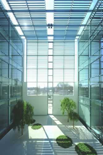 Der Rundgang bringt eine Flut von Eindrücken, sich verengenden oder erweiternden Perspektiven, Blickwechseln, Ausblicken. Man schwebt über Galerien an haushohen Wintergärten mit wechselnden Bepflanzungen vorbei, man erreicht über konvexe und konkave Treppen eine «Sky-Lobby» und ist plötzlich dem Himmel nah. Die Ausstattung liefert in ihrer Beschränkung auf weniges - künstlich orangerot gebeiztes Buchenholz, einige Lampenmodelle, Auslegeware in schäumendem Meergrün - den ruhigen Rahmen, der alles zusammenhält. Die sperrigen Verwaltungstrakte, die dem Komplex von der Seite das Aussehen eines Flugzeugträgers verleihen, ordnen die Büros um riesige Lichthöfe zu überschaubaren Gruppen. Sie lassen sich durch flügelige Lamellentüren grossräumig verbinden.