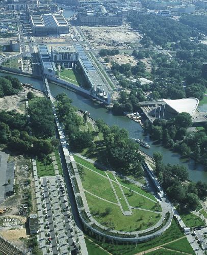 Dass die Gebäudekette den einstigen «Germania»-Planungen von Hitlers Architekt Speer in Form einer Nord-Süd-Achse gegen den Strich lief, hatte damals weniger Bedeutung, als mancher heute gerne betont, zumal die Idee der Nord-Süd-Achse schon auf Schinkel und Lenné zurückgeht. Um die städtebauliche Verträglichkeit des eineinhalb Kilometer langen Riegels kümmerte man sich nicht. Das «Band des Bundes» hätte zwar eine Brücke von Ost nach West geschlagen, gleichzeitig aber dem Norden wie dem Süden einen Riegel vorgeschoben, die anmutige Biegung des Flusses zerlegt und das letzte Haus des im Krieg zerstörten Alsenviertels, das von Diener & Diener erweiterte Gebäude der Schweizer Botschaft, ins Abseits gestellt.