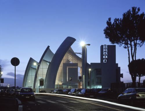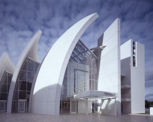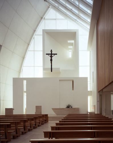 Wie ein Schiff mit drei riesigen, vom Wind geblähten Segeln steht der strahlend weiße Bau inmitten des Wohnviertels Tor Tre Teste am östlichen Stadtrand von Rom. Auf den ersten Blick ist er ein Fremdkörper zwischen den hohen Wohnblocks. Eine weitläufige, mit Travertin gepflasterte Piazza liefert dem glamourösen Schiff einen adäquaten Ankerplatz. Mauern umgeben den schlichten, unmöblierten Platz. Die profane Umgebung ist weitgehend ausgeblendet. Die Vermutung, es sei Überheblichkeit und Effekthascherei bei der Konzeption dieses katholischen Prestigebaus im Arbeiterviertel zugange gewesen, zerschlägt sich vor Ort sofort. Kirche und Platz sind ein Hort der Ruhe und eine städtebauliche Mitte in einer disparaten Umgebung. Schnell erschließt sich das Gebäude, das trotz der eigenwilligen Form durchaus klassischen Kirchenkonzeptionen mit Hauptschiff, Seitenschiffen und Glockenturm entspricht. Viel Tageslicht - und im August auch die Sommerhitze - erfüllen den Kirchenraum durch die verglasten Dächer, die zwischen die weißen Betonscheiben gespannt sind. Innovative Technologie soll das Weiß der Kirche „Dives in Misericordia“ langfristig erhalten.
