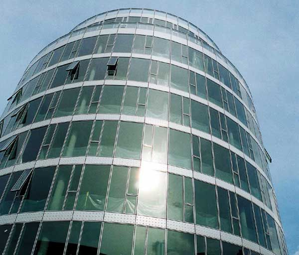 Das Foyer selbst gefällt durch seine lichte Größe, emporgestemmt von weiß lackierten Stahlrohren, die einen Gitterrost mit rautenförmigen Feldern tragen. Das Glasdach wird durch blaue Punkte verschattet, warum man dazu keine Solartechnik nutzte und lediglich ein paar Fassadenlamellen damit ausgestattet hat, ist fragwürdig. Ein rotes Portal, das als Passepartout vor der Stirnfassade schwebt, dient als Auftakt der Mall, die sich im Querschnitt wie eine Basilika mit zwei angedeuteten Seitenschiffen geriert. Sie entspricht Peichls Koketterie mit der Postmoderne. Dazu passt der runde Messeturm, der sich zwischen Foyer und Kongresszentrum drängt und ein weithin sichtbares Zauberhütchen aus Stahlstäben trägt. Hier liegt der Eingang des Kongresszentrums, nach außen ablesbar durch ein textiles Vordach wie man es von Autohäusern in Gewerbegebieten kennt.