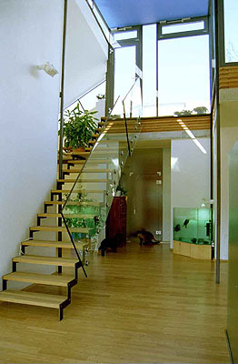 Rundum laufende Lichtbänder sorgen nur für ein lichtdurchflutetes Inneres sondern auch für phantastischen Ausblick, der die Schnee- und Witterungsverhältnisse auf der Seegrube live ins Wohnzimmer liefert. Im von der Straße abgewandten Hinterland der Wohnung liegen die Schlafräume. Blaue, gelbe und rote Flächen liefern an ausgesuchten Stellen heitere Farbakzente, die man für Projekte von Pendl und Senn fast schon als charakteristisch bezeichnen kann, da kaum einer ihrer Bauten ohne sie auskommt und farblos bleibt. Ein zusätzlicher Bonus ist die Dachterrasse, die auf dem Flachdach einer bereits bestehenden Dachbodenwohnung eingerichtet wurde. Sie erreicht man über eine Treppe, die steil auf einen verglasten laternenartigen Aufbau zuläuft und das „In-die-Berge-gehen“ vage zitiert. Schwindelfreiheit - kein Problem für gelernte Tiroler - ist also mitzubringen, um von ganz oben über die Dächer zu blicken und das Leben auf der Straße zu beobachten.