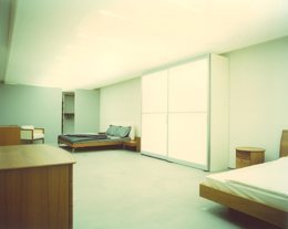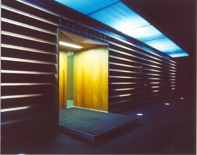 Im angrenzenden Möbelstudio ist mit möglichst neutralen und einfachen Mitteln ein Raum entstanden, welcher das ganze Augenmerk auf das zu präsentierende Produkt lenkt. Nach aussen präsentiert sich nur ein Körper aus Alu und Glas, der durch die Fassade dringt. Die Ausführung in grauem Estrich, mit weißen Wänden und einer schwarzen Decke, bzw. Textildecke mit Oberlichten, ermöglicht unterschiedlich inszenierte Raumabfolgen. (11.06.2001)