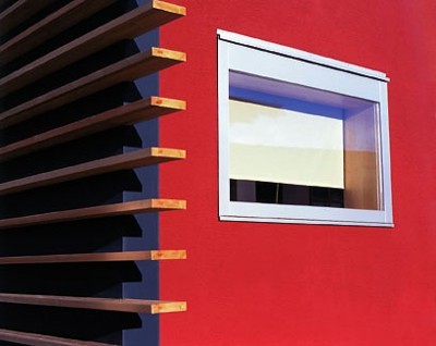 Durch ein 28 Meter langes und 2 Meter auskragendes, mit Harz beschichtetes Glasdach werden die Baukörper gefasst. Eine vorgesetzte Fassade aus anthrazitfarbenen Faserzementplatten nimmt die Geschwindigkeit des vorbeiziehenden Verkehrs auf und verleiht dem Gebäude ein neues Gesicht. Die Farbgestaltung in Eisenoxydrot verstärkt zusätzlich den Kontrast zum neugestalteten Fassadenbereich mit den horizontalen Lärchenlamellen. Gleichzeitig verweisen die Lamellen an der Fassade auf die dahinterliegende Nutzung.
