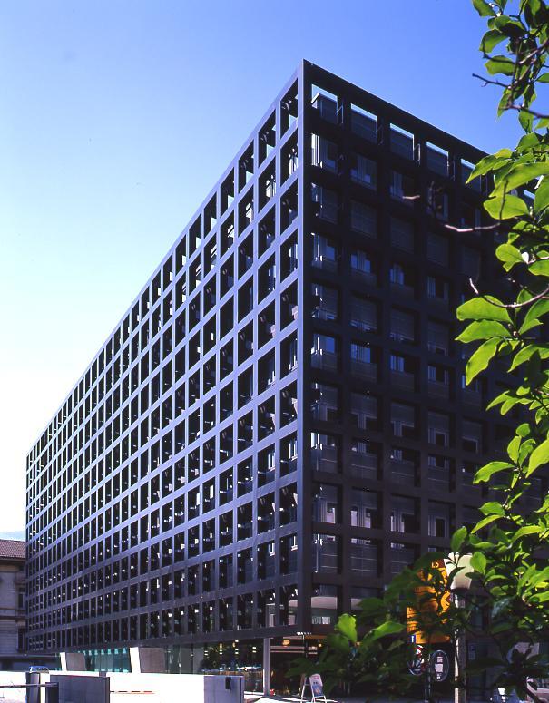 Erst wenn man hinaufschaut in die rund anderthalb Meter tiefe raumhaltige Gebäudehülle, erblickt man Stahlbalken, welche die Geschossebenen des inneren Doppelhauses an das tragende Gitterwerk binden. Diese neuartige, mit dem Chitinpanzer eines Schalentiers vergleichbare Konstruktion befreit den Innenbau vom sonst üblichen Skelett der Stützen und der Pfeiler. Zugleich übernimmt sie als gigantische Sonnenblende die Funktion der Klimahaut und erzeugt mit den dahinter liegenden hellen Wandflächen stets neue Lichteffekte: von bleiernem Schwarz bis zu lichtem Stahlblau. Dieser Wechsel sorgt für eine Dynamik, welche die Fassaden, wie Vacchini begeistert festhält, bald «männlich stark», bald «weiblich empfangend» erscheinen lässt, was dem kompromisslosen Bau eine humane Dimension verleiht. Auf das Chaos des vom Boom der letzten Jahrzehnte geschundenen Quartiere Nuovo kann er so - im Dialog mit dem spätklassizistischen Palazzo del Pretorio von Ferdinando Bernasconi - klärend und festigend einwirken.