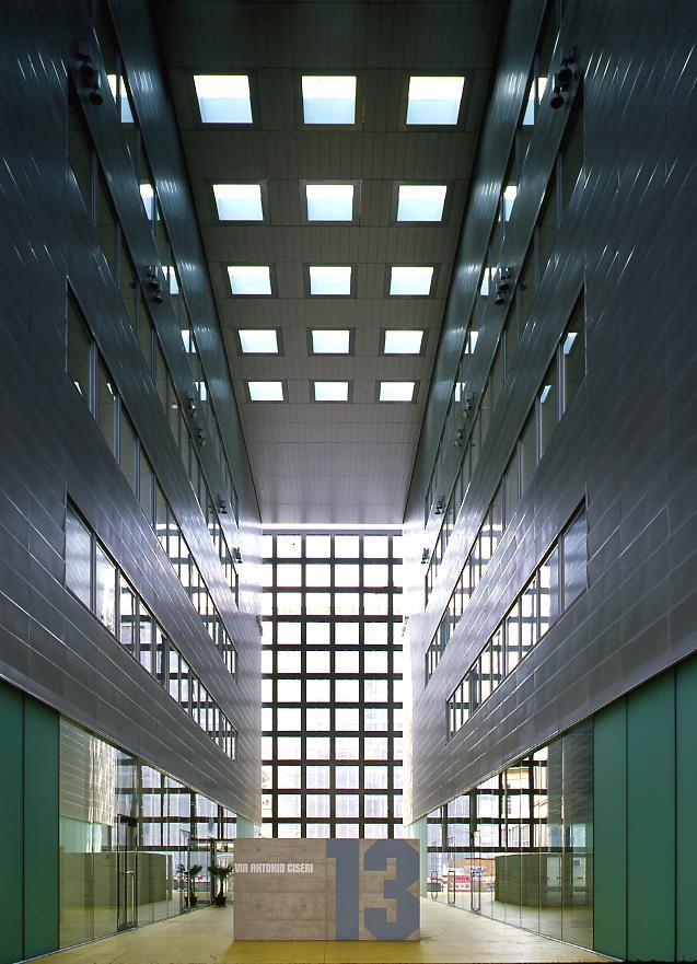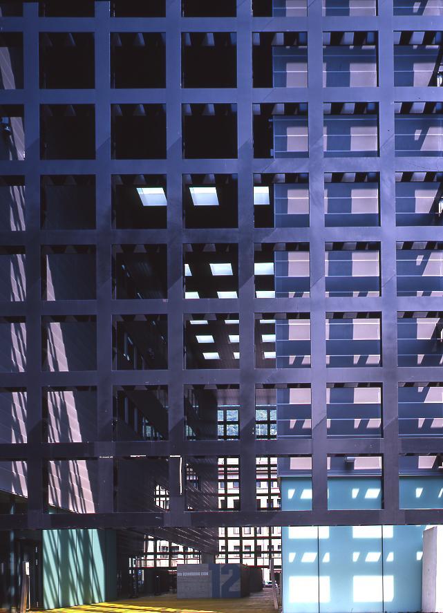 Mit ihrem alle vier Fassaden umhüllenden Gitterwerk aus braunschwarzem Stahl, bei dem sich Transparenz und Verschleierung die Waage halten, bildet die Ferriera einen in der Höhe halbierten Würfel. Trotz seinem Gewicht von 1200 Tonnen scheint dieser mächtige Metallkäfig über acht gedrungenen Betonpfeilern zu schweben, fast wie Le Corbusiers Pilotis-Bauten. Aufgrund der Massstabslosigkeit will das Auge jedem der elf übereinander liegenden, aus quadratischen Rasteröffnungen bestehenden Fassadenstreifen eine Etage zuordnen. Damit nimmt das in Wahrheit nur sechsgeschossige Gebäude geradezu grossstädtische Dimensionen an - vergleichbar mit Steven Holls unlängst vollendetem Studentenheim in Cambridge, Massachusetts (NZZ 4. 7. 03), das auf den ersten Blick ähnliche Fassaden aufweist. Doch anders als Holls Wohnmaschine verzichtet Vacchinis rigides Geschäftshaus auf liebliche Farbakzente und regelwidrige Durchbrüche.