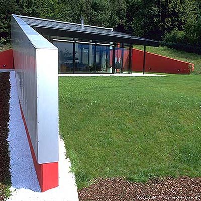 Zwei ineinander verschränkte Winkel bilden die Grundform des im Norden in den Hang eingeschnittenen Anwesens. Sie umschließen bergend die Wohnraume und einen großen Garten. Die Straßenfassade ist rigoros radikal: Wie eine Sprungschanze verläuft ein breites Aluminiumband dem Hang folgend über einem signalrot gestrichenen Sockel.