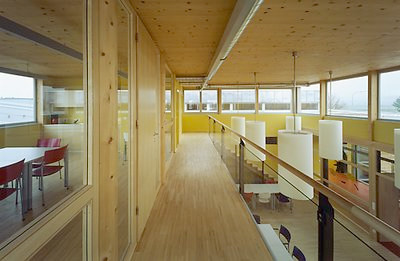 Im Gegensatz zur unreflektierten Materialschlacht der benachbarten Gebäude verzichtet das Tagesheim auf die verschwenderische Palette von Werkstoffen und konzentriert sich auf das Thema Holz. Für die Aussenwandverkleidung wurde witterungsbeständiges Lärchenholz verwendet, für die tragende Konstruktion kamen KLH-Brettsperrholzplatten zum Einsatz, wobei die Decken innen sichtbar bleiben und die Wände innenseitig mit raumklimatisch vorteilhaftem Lehmputz versehen sind. Grosse Fensterflächen, umfangreiche Oberlichten mit ausgeklügelter Lichtumlenkung über den Zentralräumen versorgen das gesamte Tagesheim maximal mit Tageslicht.