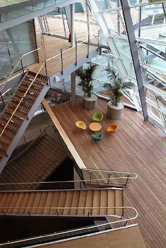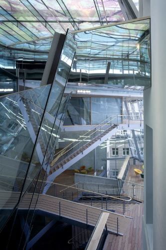 Besucher lassen im leicht ansteigenden Foyer das Niveau der Strasse sogleich hinter sich auf dem Weg in höhere Gefilde. Hier öffnet sich die Akademie als Lichthof hoch hinaus mit Stegen, Treppen, Podesten und verschobenen Ebenen. Dem Akademiepräsidenten werden die luftig gelegenen Standorte, die sich für die traditionelle Treppenrede anbieten, in Zukunft Schwindelfreiheit abfordern. Es ist nicht zu übersehen, dass dieser Kulturdampfer in Scharouns Bücherschiff der Staatsbibliothek im Westen der Stadt einen Vorläufer besitzt. Ein unmissverständliches Statement hat sich Behnisch als Baumeister der Bonner Republik also doch noch geleistet in Berlin, wo die Baupolitik die Moderne gern zu ihrem Feindbild erklärt. Im Eingangsbereich teilen sich die Wege zum Verwaltungstrakt, zu den historischen Räumen und hin zu einem Wandelgang, der sich als öffentlicher Weg durch das ganze Gebäude hindurchzieht und den Pariser Platz mit dem Holocaust-Mahnmal an der Behrensstrasse verbindet. Eine freundliche Geste der Durchlässigkeit im Stadtzentrum, das aufgrund der Sicherheitsbestimmungen mancher Botschaften mittlerweile Sperrgebiet ist.