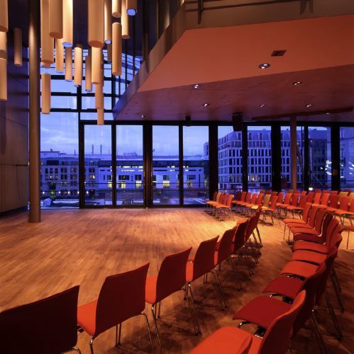 In ihrem Inneren zeigt sich die Akademie als Haus der Begegnung, das nachts einladend in den Stadtraum leuchtet: eine Raumlandschaft, die immer neue Perspektiven freigibt, wenn man sie erkundet. Die Materialien sind dezent gewählt mit Terrazzoböden, Eichenparkett und Treppengeländern aus Metall und Ahornläufen. Vielschichtig wird die wechselvolle Geschichte des Ortes lesbar, der im Dritten Reich von Speers Generalbauinspektion und später von den DDR- Grenztruppen genutzt wurde. Farbliche Referenzen an das Brandenburger Tor im Plenarsaal und im Klubraum öffnen das Haus optisch zum Pariser Platz. Berlin ist nicht arm an Aussichtspunkten. Aber von hier aus hat man den atemraubendsten Blick: Auge in Auge mit der Quadriga, sieht man zum Kanzleramt im Spreebogen und zur Reichstagskuppel hinüber.