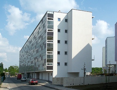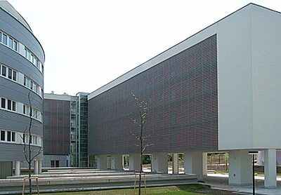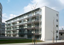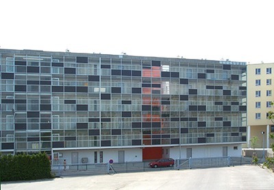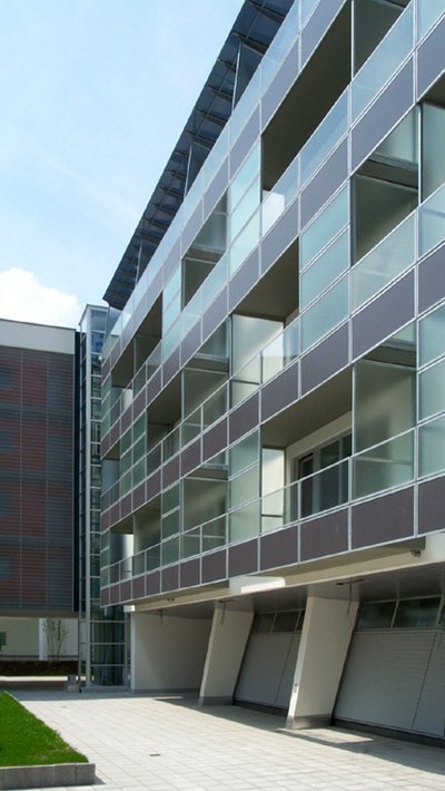 Entlang der Laaer-Berg-Strasse markieren die quer zur Strasse errichteten Baukörper die Strassenflucht. Sie stehen senkrecht zur Strassenflucht, um eine optimale Besonnung der Wohnungen zu gewährleisten. Der ergänzende Schallschutz wird durch quergelagerte Nebenraum-Baukörper in Verbindung mit transparenten Lärmschutzwänden erzielt. So wird die Lärmbelästigung entlang der Strasse reduziert. Die gesamte Anlage bleibt jedoch durchlässig und nach aussen offen.