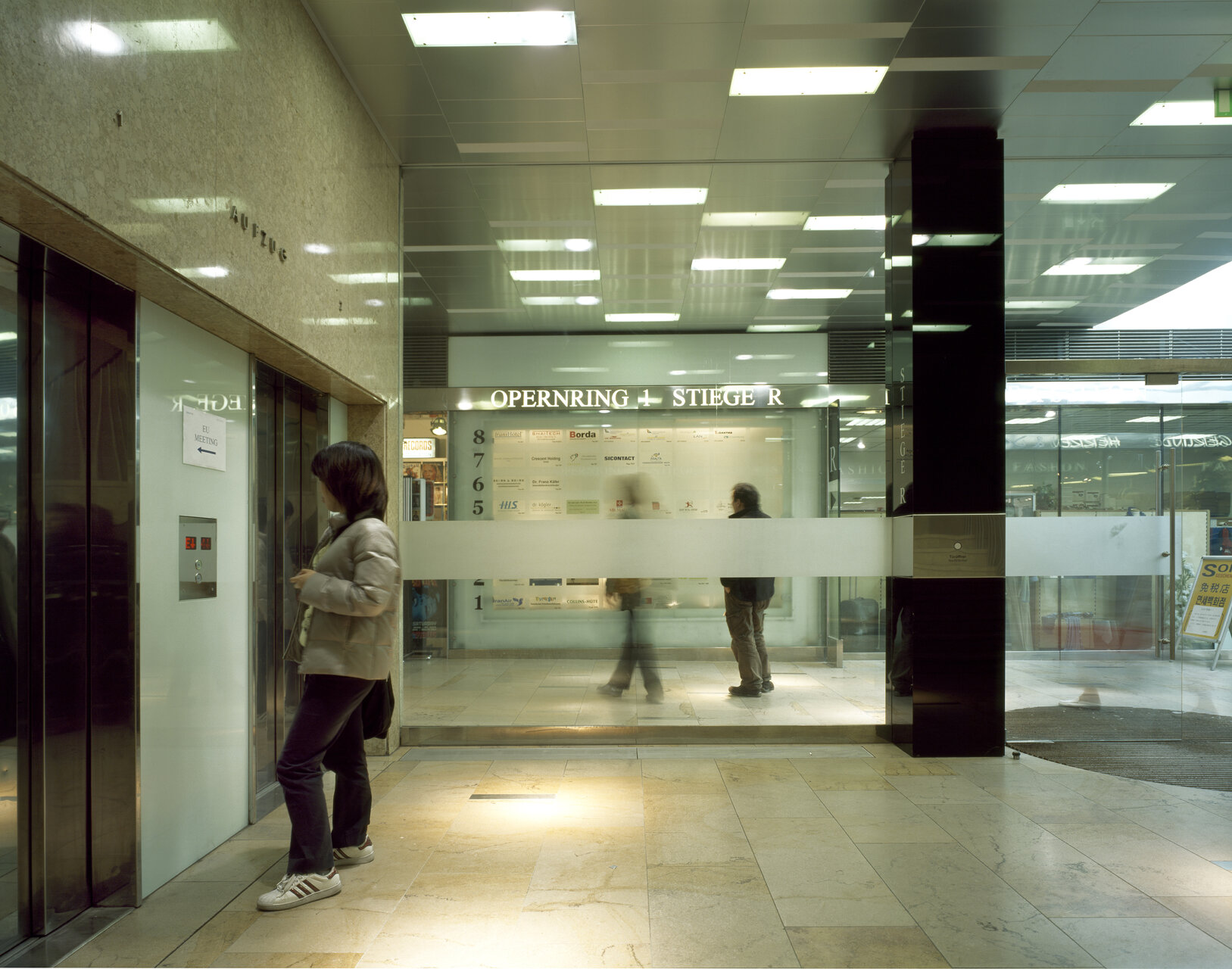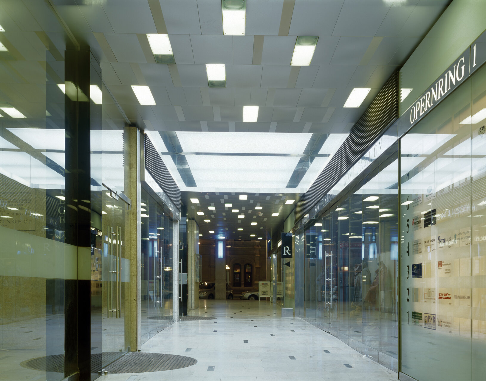 Der Maßnahmenkatalog umfasste u.a. die Erneuerung der Geschäftsportale und der Fassadenbeleuchtung, die Sanierung und Neugestaltung der öffentlichen Erschließungsflächen inklusive Glassteinfassaden und Aufzügen, den Einbau einer zentralen Kühlung der Büros sowie den Umbau einzelner Büros (Kanzleien, Ordinationen, Botschaften). Im Umgang mit dem freistehenden Block in städtebaulich sensibler Lage zwischen Karlsplatz und Staatsoper übte sich lakonis in nobler Zurückhaltung und versuchte, die Qualitäten der in gewisser Weise „schwierigen“ Substanz zu stärken. Dazu die Architekten: „Die 50er Jahre waren eine Zeit technischer Euphorie und zugleich eine Zeit, in welcher der gesellschaftliche Konsens nach dem Krieg gesucht wurde. Das führte zu einer Architektur, die als Stahlbeton-Skelettbau zwar selbstverständlich die bautechnischen Möglichkeiten ihrer Zeit nutzte, die sich in ihrer gestalterischen Aussage aber zugleich sehr zurücknimmt und geprägt ist von klassischen Elementen wie z.b. einer Dreiteilung der Fassade sowohl in der Höhenentwicklung als auch auf die Gebäudelänge. Diese Teilungen sind aber nur schwach angedeutet, wodurch dem Gebäude eine gewisse Monotonie eignet. Umso empfindlicher ist die Architektur gegenüber unbedachten Veränderungen.“ Die besondere Aufgabe des Sanierungskonzeptes bestand daher darin, für notwendige Baumaßnahmen einen entsprechenden architektonischen Ausdruck zu finden, ohne die Authentizität des Bestands zu gefährden. Die umgestaltete Opernring-Hof-Passage mit ihrem Steinboden, der Aluminiumdecke und einem eigens entwickelten Beleuchtungskonzept ist für diesen einfühlenden Ansatz ein besonders deutliches Beispiel. (Text: Gabriele Kaiser)
