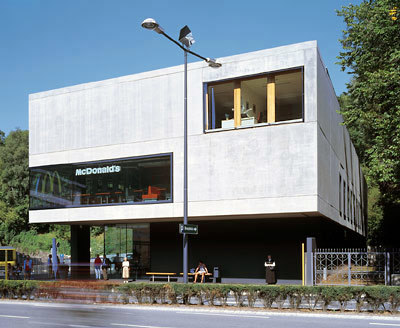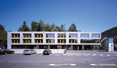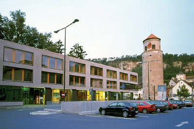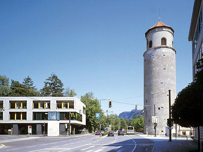 Das Konzept eines dreigeschoßigen keilförmigen Baukörpers wurde in der Überarbeitung beibehalten und verschärft, zugunsten der Größe des Busplatzes und der leichteren Unterbringung von Rangierflächen rückte er jedoch bis zu drei Meter an die Grundgrenze des bischöflichen Palais heran. Zum Vorteil der klerikalen Anrainer: Die Nichteinsehbarkeit des bischöflichen Gartens bleibt gewahrt, die Problematik der Schallimmissionen ist entschärft. Arkaden an den Längs- und Schmalseiten des sachlich neutralen Gebäudes mit gemischter Nutzung (Mc-Donalds-Restaurant, Geschäftslokale und Büroflächen) tragen zur Verschränkung von Bauwerk und Stadtraum bei. Der Asphaltbelag des Busplatzes repitiert im Sinne eines möglichst homogenen Gesamtbildes die Textur des Sparkassenplatzes und meidet allzu deutliche Differenzierungen der Verkehrsarten. (Text: Gabriele Kaiser, 25.02.2003)