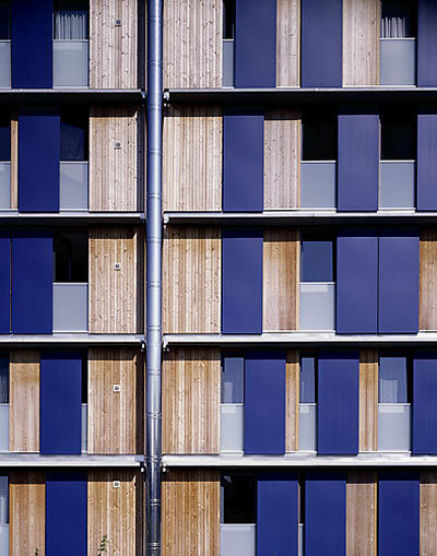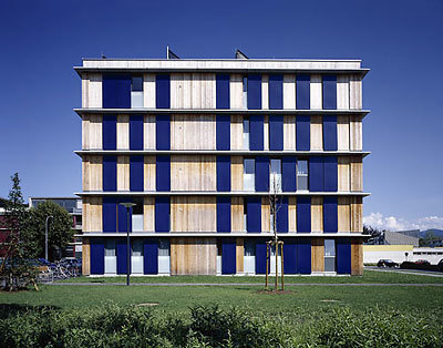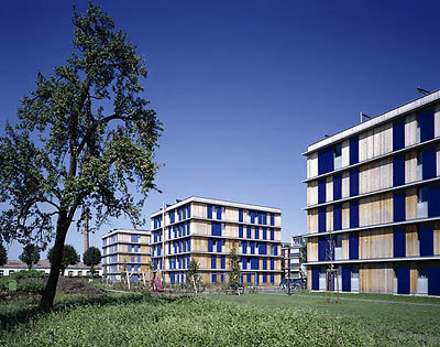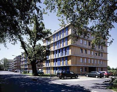 In der Grammatik kostenbewussten Wohnungsbaus kann die Stapelung oder Reihung gleicher Strukturen durch eine sensible massstäbliche Fassung an Identität gewinnen. Um einen zentralen Erschließungskern sind in jedem der fünfgeschossigen Würfel im Windradprinzip je vier Wohnungen angeordnet. Raumhohe Fenster mit Schiebeläden (mit integrierter Photovoltaikfunktion) verleihen der Bebauung ein markantes Erscheinungsbild, eine landschaftsplanerisch großzügig gestaltete Grünanlage öffnet Sichtbezüge in einem relativ offenen Umfeld. Ein freistehendes Einfamilienhaus könnte kaum mit besseren Bedingungen locken. (Text: Gabriele Kaiser, 04.03.2003)
